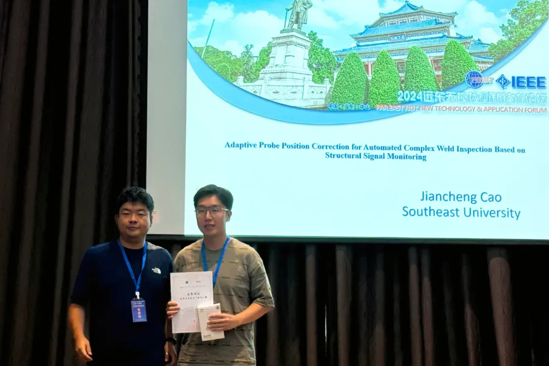 团队曹健铖博士于2024远东无损检测新技术论坛作题为《Adaptive Probe Position Correction for Automated Complex Weld Inspection Based on Structural Signal Monitoring》的报告,并获当届优秀学生论文奖。