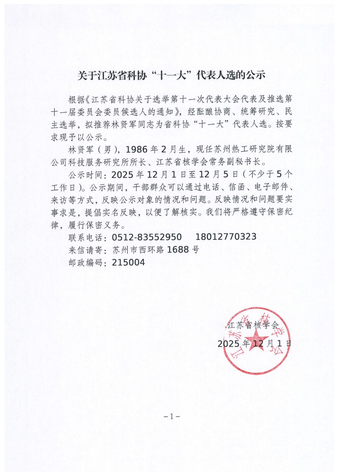 关于江苏省科协“十一大”代表人选的公示